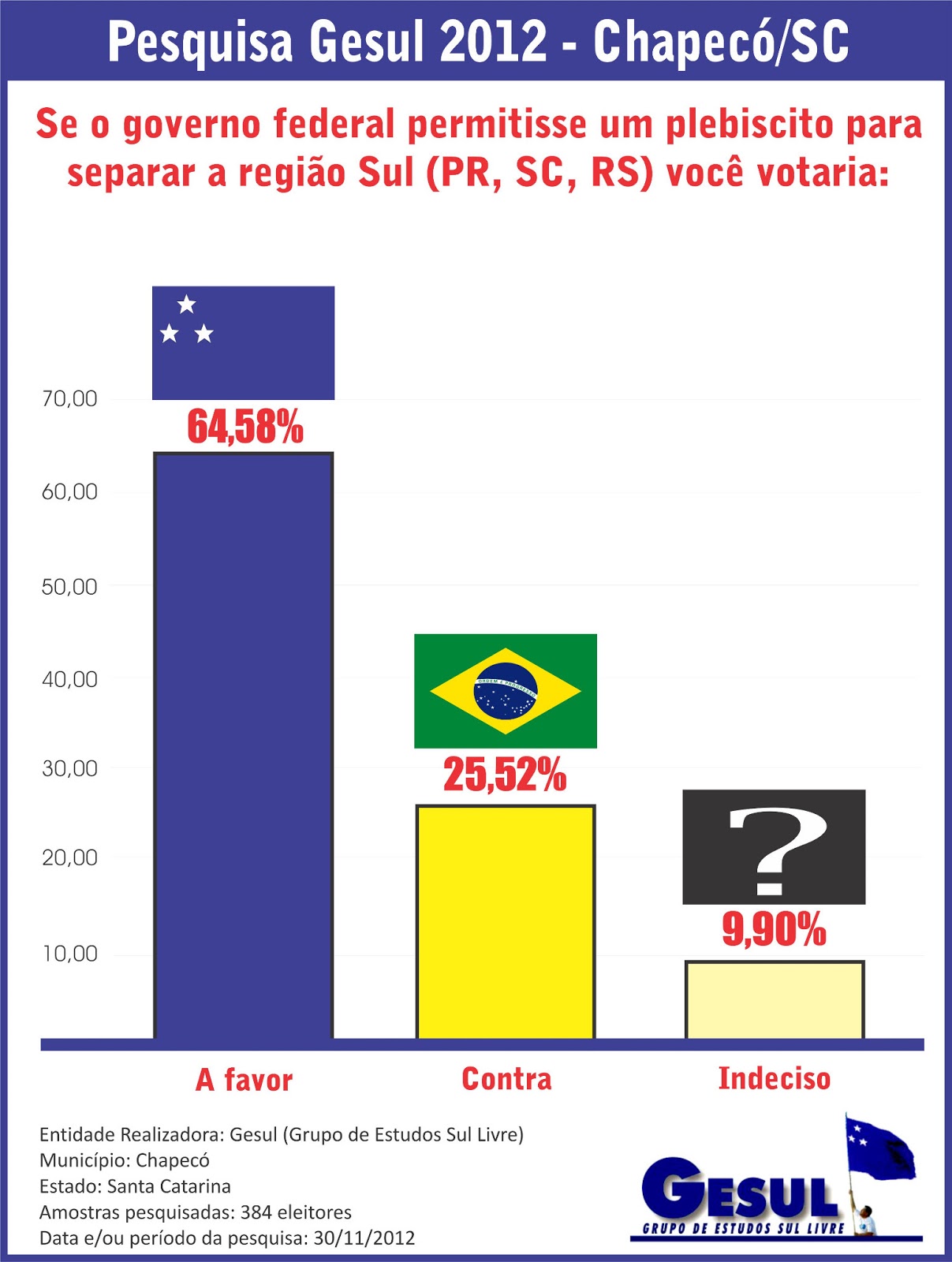 As pesquisas em todos os municípios seguem nos gráficos em anexo, divulgados pelo Gesul na tarde desta quinta-feira, dia 20. Neles aparecem além dos gráficos as bandeiras do Brasil, significando os que são contra a proposta, uma interrogação para os indecisos e uma bandeira em azul Royal com três estrelas (Alfa, Gama e Beta) alinhadas em triângulo no canto superior esquerdo, que segundo Celso Deucher, são os três Estados do Sul. “Esta é a bandeira do Movimento O Sul é o Meu País, principal entidade organizada que defende esta proposta de autodeterminação parcial ou total dos três Estados meridionais”, explica.